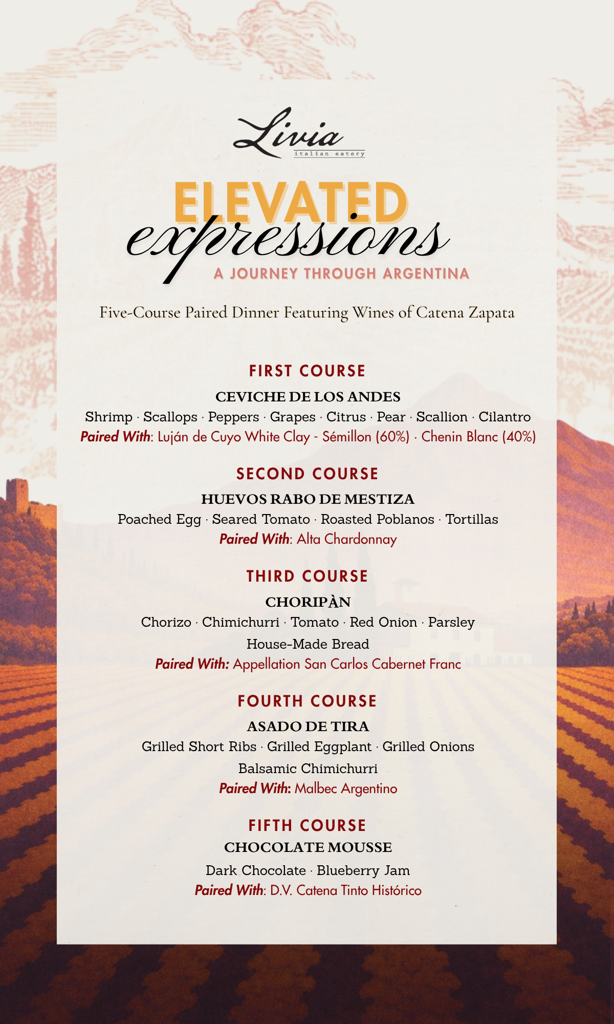 Experience an evening of elevated food and wine at Livia Italian Eatery with Elevated Expressions: A Journey Through Argentina. This five-course paired dinner by Executive Chef Matt Schmuck is thoughtfully designed to showcase the pioneering wines of Catena Zapata and the rich culinary spirit of Argentina.